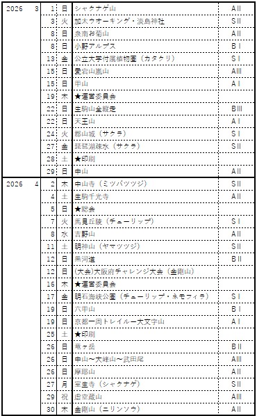 私たちハイキングクラブでは、今月下記の例会山行を予定し、自然観賞、ハイキング、登山を楽しむ予定です。